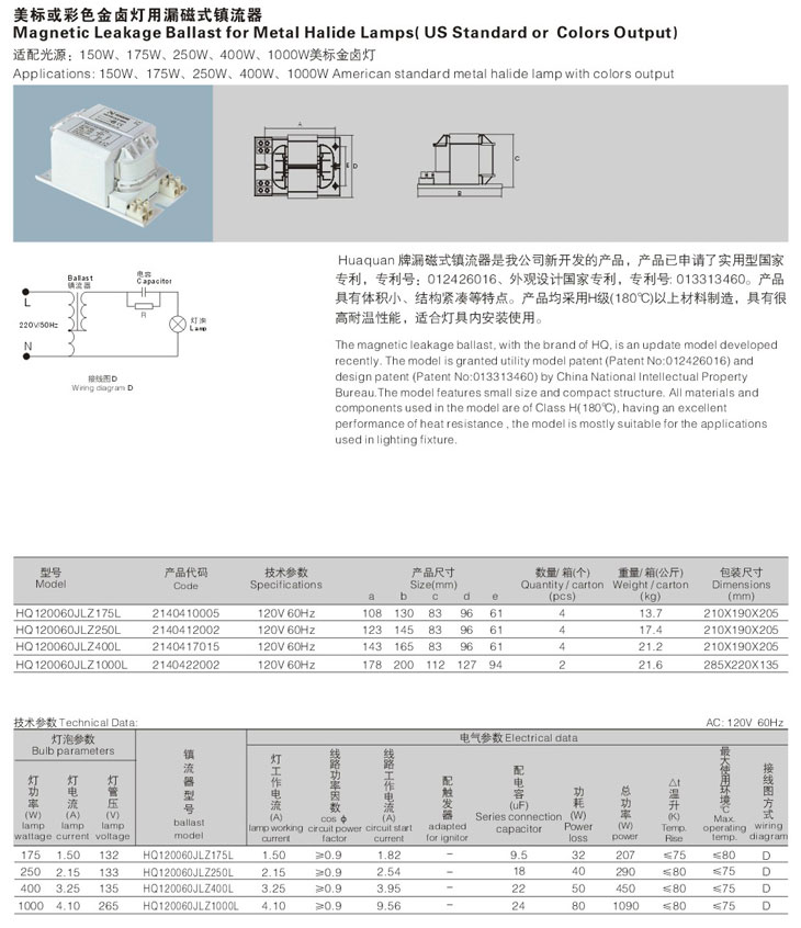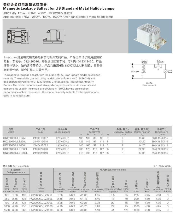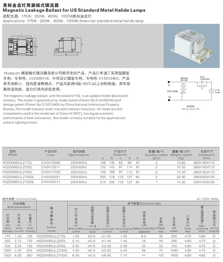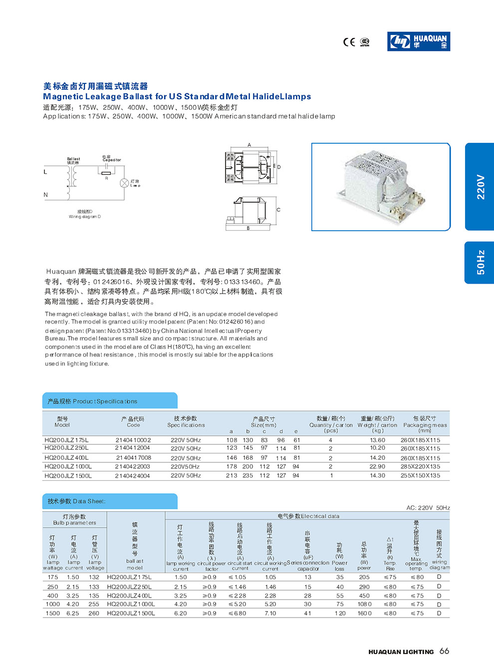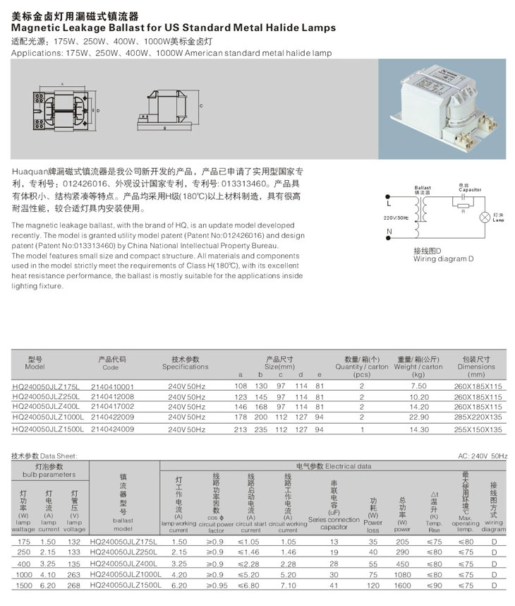 適配光源:150W、175W、250W、400W、1000W、1500W 美標金鹵燈